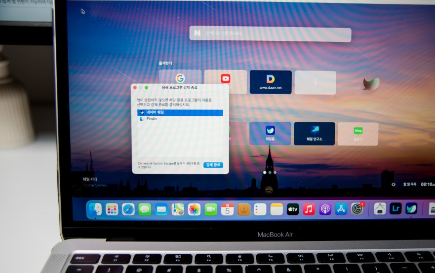 걱정할 것 없습니다. 그렇게 하면 되니까요. 디스플레이 하단을 보면 독 Dock이 있습니다. 여기서 다운된 앱을 우클릭한 다면 강제 종료를 선택해주면 다운된 앱 강제종료 끝!