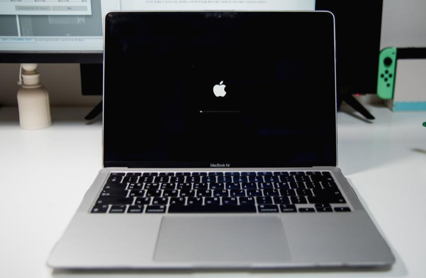 약간의 시간이 흐른 뒤, 다시 전원 버튼을 눌러 맥북에어를 켜면 두둥~ 하는 시그니처 사운드, 그리고 왜 때문인진 모르지만 감성이 가득 담긴 듯한 애플 로고가 표시되며 정상적으로 부팅되는 걸 볼 수 있습니다.