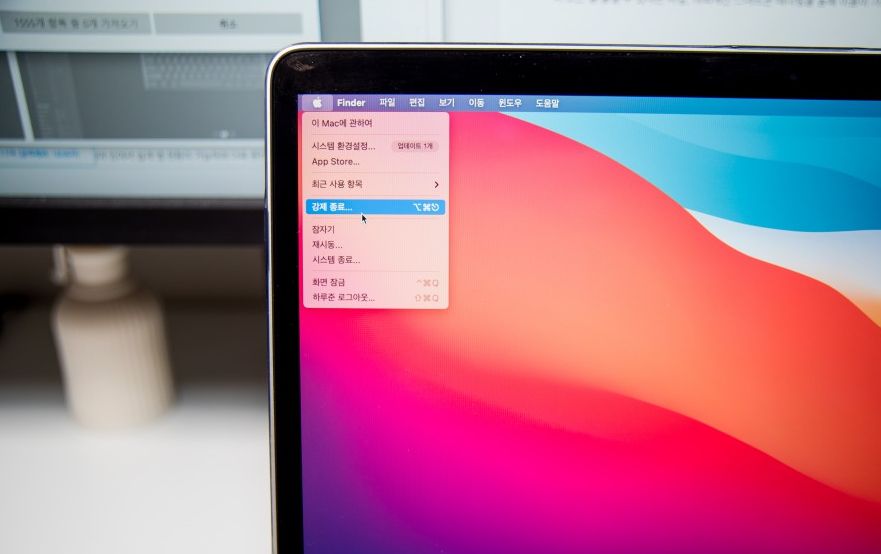 디스플레이 좌측 상단에 각 잡고 표시되어 있는 애플 로고를 한 번 클릭해 봅시다. 그럼 팝업 형태로 다양한 메뉴가 표시되는데 거기 보이시나요? 강제 종료!