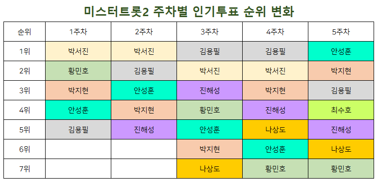 1차부터 5차까지 미스터트롯2 인기 투표 순위 변화를 정리해 보았습니다. 앞서 말씀드린 것처럼 매주 1~2위를 차지했던 박서진 참가자의 탈락 이후 안성훈 참가자의 순위가 급등하며 1위를 차지했습니다.