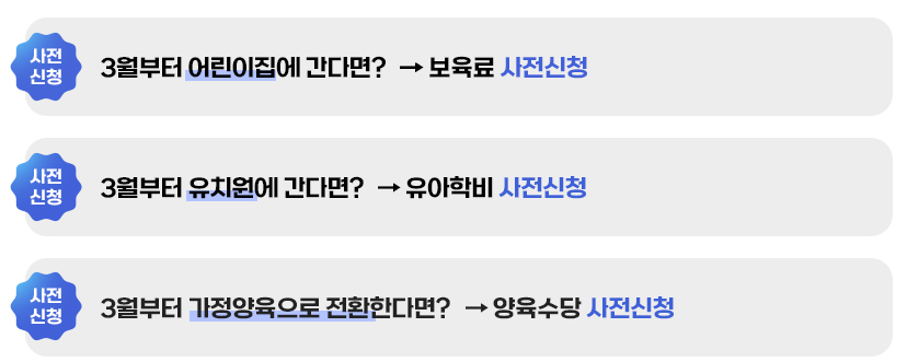 3월부터 아이가 어린이집 / 유치원에 가거나 가정양육으로 전환한다면 각각 보육료 양육수당, 유아학비 사전신청을 진행하시면 됩니다.