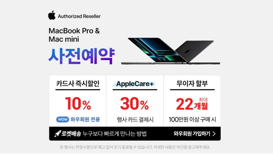 ▶ 사전예약 혜택 : 오픈 마켓 이용 시 맥북 프로 M2 카드 할인 10%, 애플케어 플러스 30% 할인 적용 및 무이자 22개월