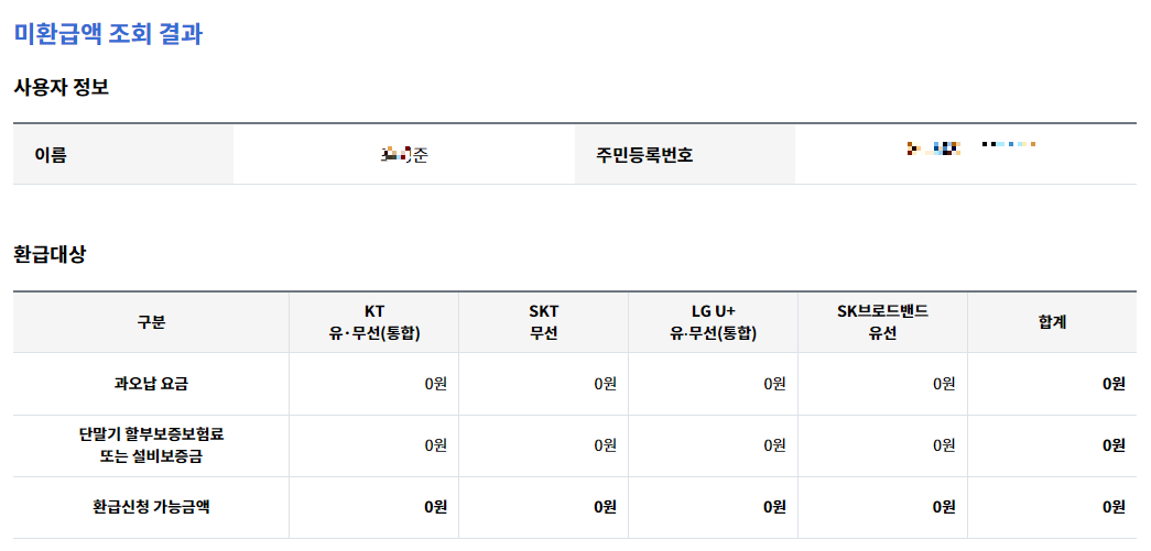 저도 한달 전 통신비 미환급금을 조회해 보니 2만원 정도 환급되지 않은 돈이 남아 있는 걸 확인해 바로 환급 받았는데요. 이미 환급을 받아서 현재 조회 결과에 표시되진 않네요. 여러분들도 이렇게 통신비 미환급액이 남아 있을 수 있으니 꼭 조회해보시기 바랍니다.