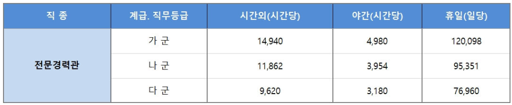 전문경력관의 2023년 시간외 근무수당은 크게 가, 나, 다 3개의 군으로 분류되어 지급됩니다. 전문경력관이라고 하지만 다군을 기준으로 시간 외 수당이 일반직 공무원과 동일한 9,620원, 야간 시간 외 수당은 조금 늘어난 3,180원, 휴일 수당도 살짝 증가한 76,960원입니다.