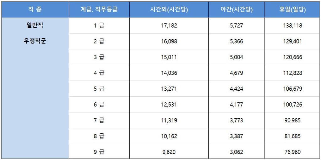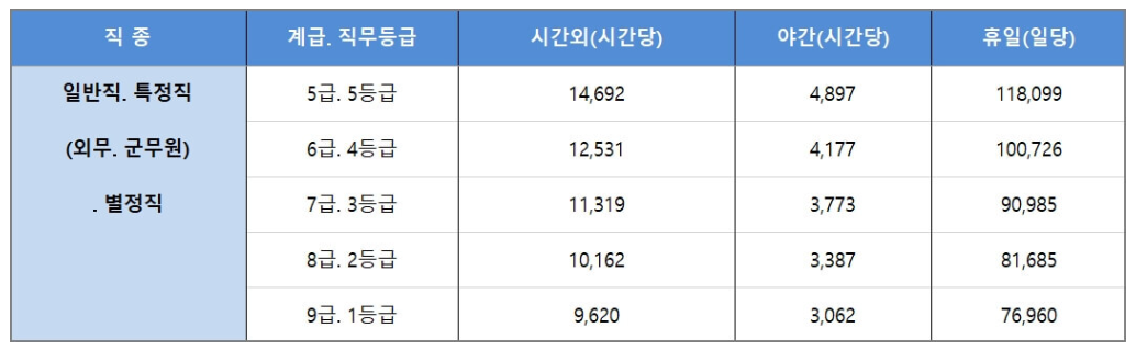 공무원도 정말 다양한 직군으로 나뉘어져 있고, 또 해당 직군마다 다른 급여 체계를 가지고 있기 때문에 직군별 공무원 초과근무수당 단가표 금액도 조금씩 차이가 있습니다.