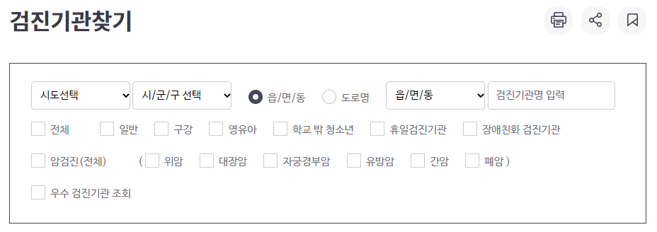 건강검진 대상자 조회 후 아래에 있는 「검진기관 찾기」 버튼을 누른 후 시도, 시/군/구 등 세부 항목 선택을 통해 가까운 곳에 검진 가능한 의료기관을 확인할 수 있습니다.