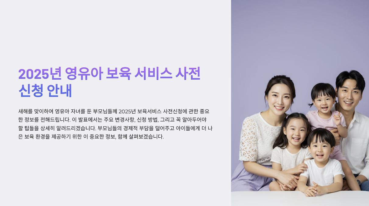 새로운 한 해가 시작되었습니다! 2025년에는 영유아 자녀를 둔 가정에 중요한 변화가 있을 예정인데요, 바로 영유아 보육서비스에 대한 사전신청이 시작된다는 소식입니다. 이번 글에서는 2025년 영유아 보육서비스의 주요 변경 사항과 함께, 사전신청 방법, 그리고 신청 시 꼭 알아두어야 할 팁들을 소개하겠습니다. 아이들의 양육과 교육에 대한 부담을 덜어줄 수 있는 중요한 지원을 놓치지 않도록 꼼꼼하게 확인해 보세요.