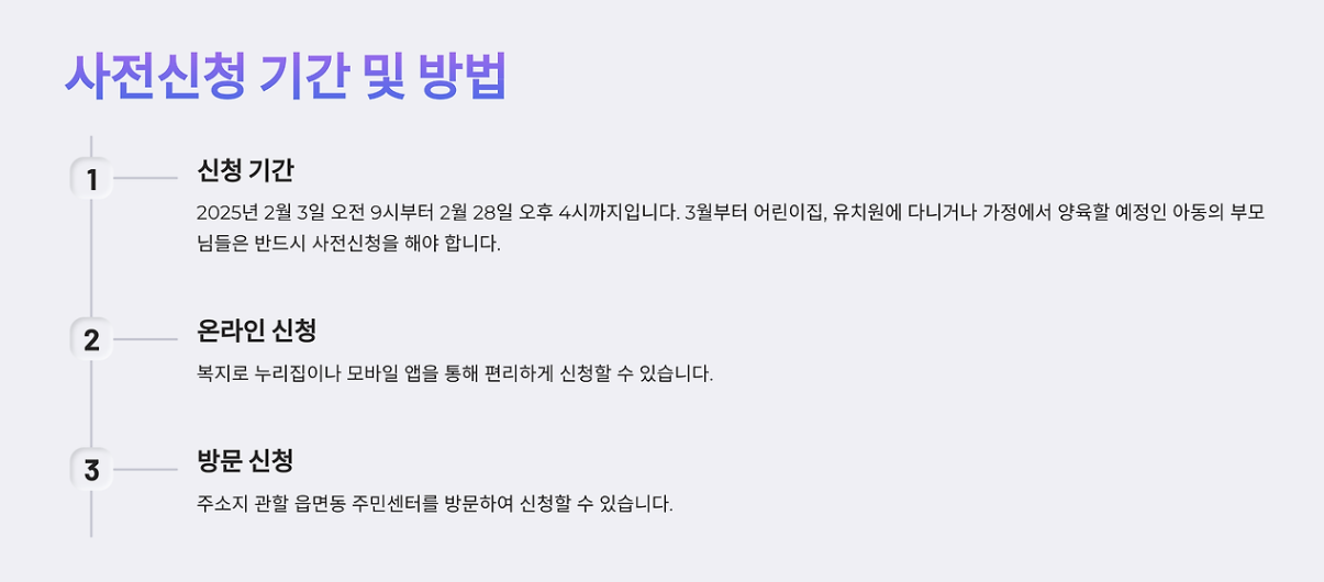 2025년 영유아 보육서비스 신청은 2025년 2월 3일부터 2월 28일까지 진행됩니다. 이 기간 동안 꼭 사전신청을 하셔야 하며, 신청 방법은 온라인과 방문 신청 두 가지로 나뉩니다.