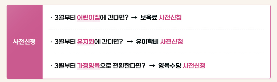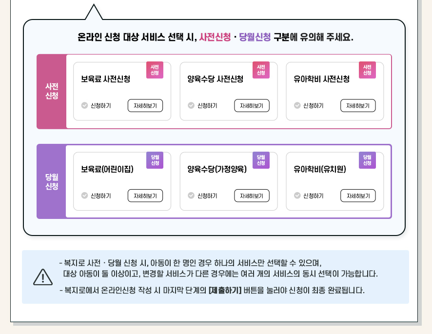 - 유아학비 지원과 보육료 지원은 중복으로 신청할 수 없습니다. 부모님은 자녀의 교육 방식에 따라 하나를 선택해야 합니다.
