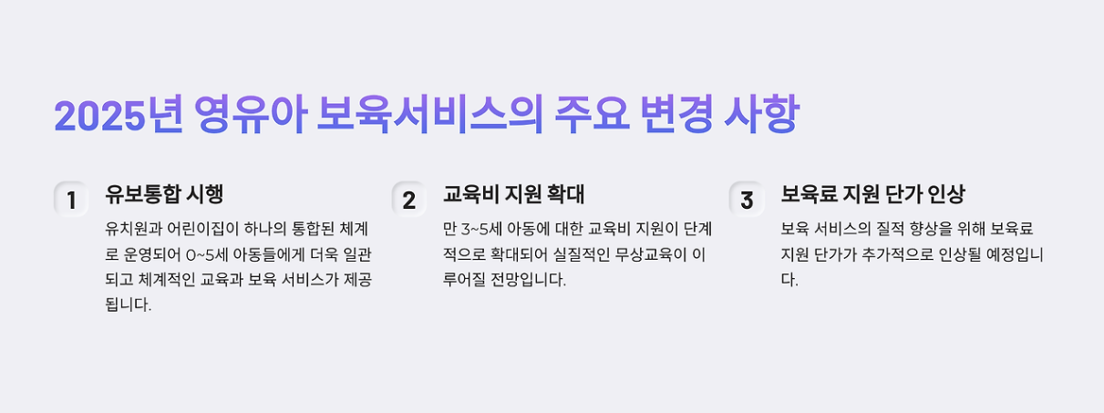 2025년부터는 영유아 보육서비스에 몇 가지 중요한 변화가 있을 예정입니다. 부모님들이 놓치지 말아야 할 핵심 사항들을 소개합니다.
