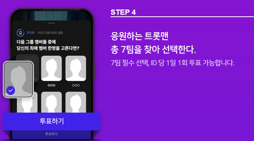 그러면 바로 투표에 참여할 수 있는데요. ID당 하루에 한 번, 7명에게 투표가 가능하기 때문에 응원하는 참가자들을 선택한 다음 화면 아래에 있는 「투표하기」 버튼까지 눌러주시면 완벽하게 투표가 마무리됩니다. 잊지 마시고 참가자 선택 후 화면 하단에 있는 투표하기 버튼까지 꼭 눌러주면 끝! 불타는 트롯맨 투표하는 방법, 참 쉽지 않나요?