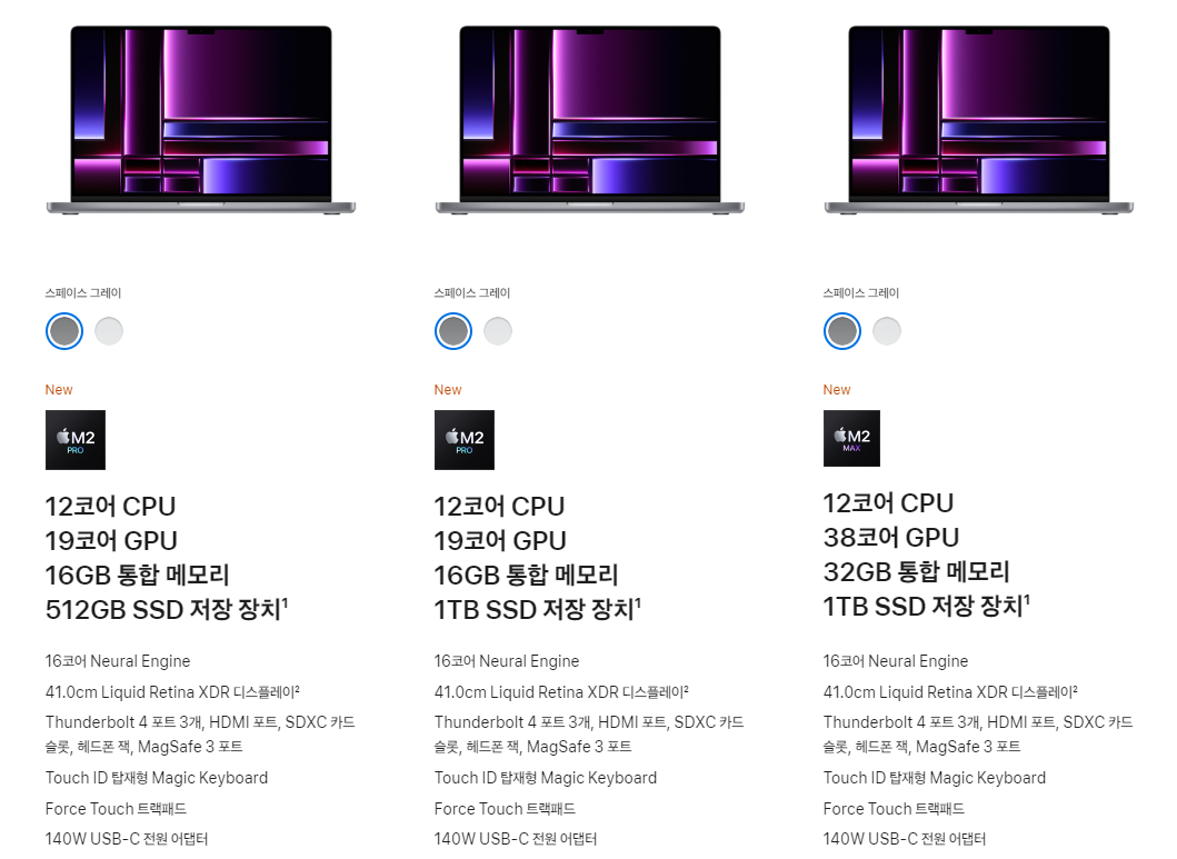 새로운 애플 맥북 프로 M2 모델은 14인치와 16인치 두 가지 사이즈로 출시가 됩니다. 또한 칩셋 역시 프로와 맥스 두 가지 버전으로 출시하기 때문에 본인의 사용 용도에 맞는 제품을 선택하는게 중요합니다.